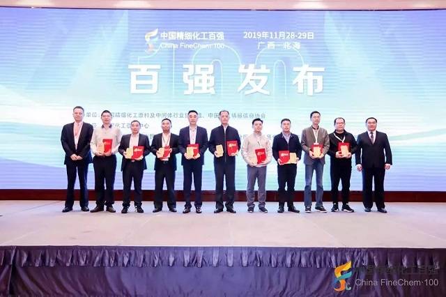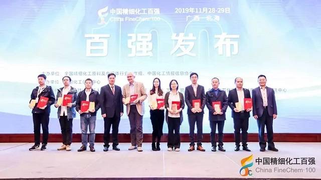 2019年11月28日,在由全国精细化工原料及中间体行业协作组、中国化工情报信息协会在广西北海联合主办,中国化工信息中心承办,北海市铁山港区人民政府、北海市铁山港(临海)工业区管理委员会协办的“第十九届国际精细化工原料及中间体(铁山港)峰会暨2019中国精细化工百强发布会”上,公布了“2019中国精细化工百强”榜单。